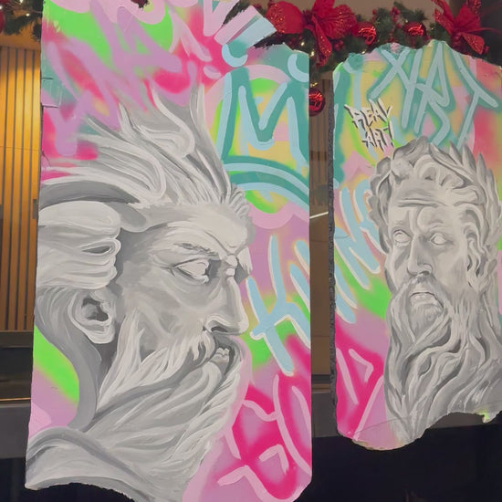 Antes del oro, hubo color. Nacimos entre muros intervenidos por el graffiti, pero siempre con la mirada en lo eterno. Allí, donde Zeus lanza el rayo que marca la grieta, y Poseidón, dios del terremoto, abre la fractura que permite renacer.